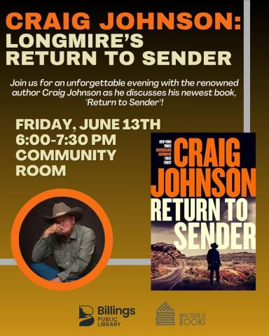 Join the Billings Public Library and This House of Books for an evening with Craig Johnson! The bestselling author's most recent book is the latest Longmire installment Return to Sender, and he will be reading an excerpt, answering audience questions, and signing as many copies of the book as people are interested in buying.